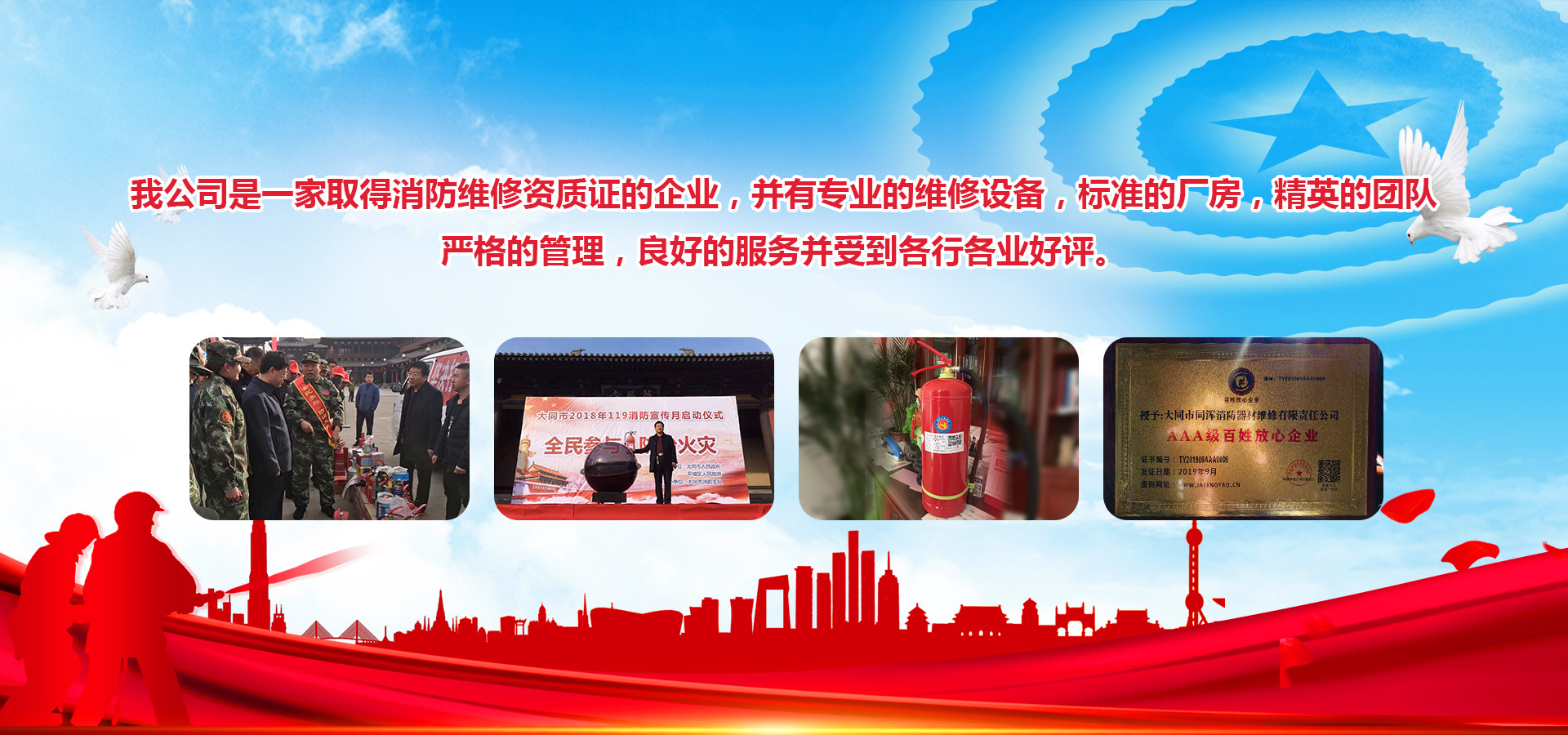 大同市同渾消防器材維修有限責(zé)任公司,位于大同市同泉路389號(hào),始建于2000年,是公安部消防局定點(diǎn)銷售和維修的企業(yè),歷經(jīng)多年的創(chuàng)建、發(fā)展和拼搏,現(xiàn)有多家消防器材廠商供應(yīng)我公司,并有現(xiàn)代化維修設(shè)備,標(biāo)準(zhǔn)的廠房,嚴(yán)格的管理,優(yōu)良的設(shè)備,良好的服務(wù)并受到各行各業(yè)的好評。總經(jīng)理劉國玉嚴(yán)格管理,嚴(yán)格要求,精益求精,認(rèn)真負(fù)責(zé),帶領(lǐng)團(tuán)隊(duì)熱烈歡迎各界朋友顧客光臨。